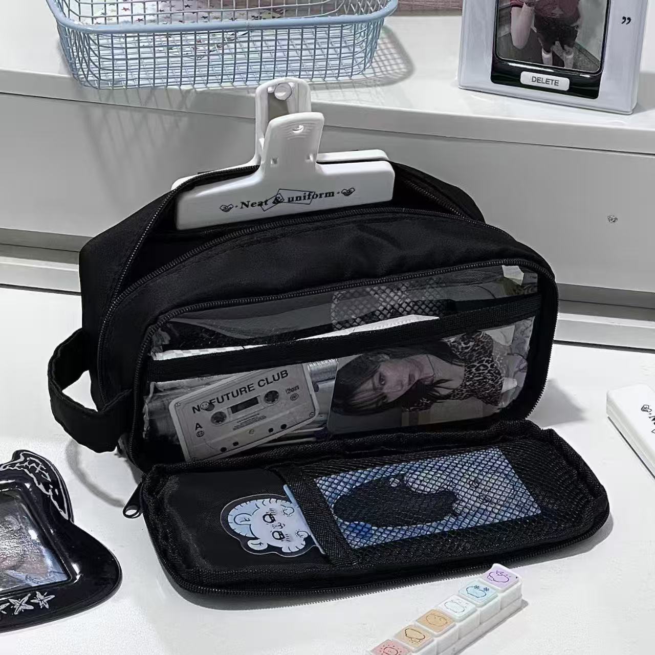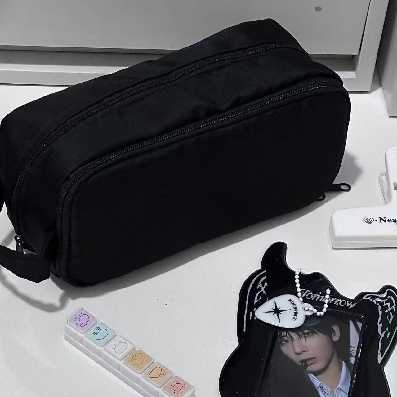 2025新款ins风暗夜黑多功能手提笔袋学生高颜值大容量文具盒纯色收纳袋日系双层黑色初中男生女生简约铅笔盒