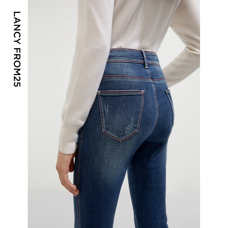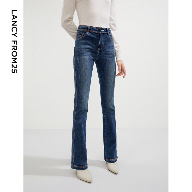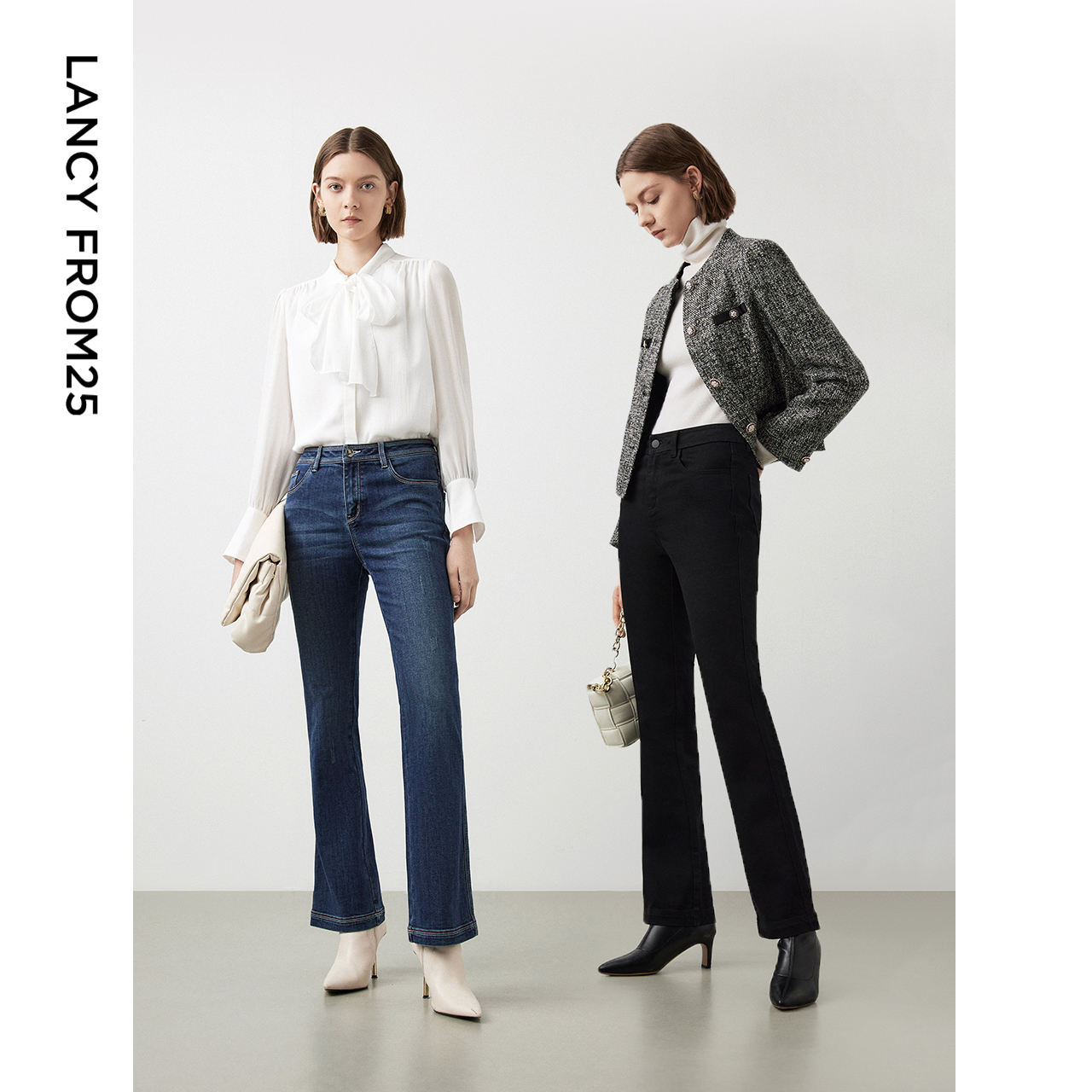 朗姿复古休闲高腰微喇牛仔裤气质直筒显瘦修身通勤九分裤春季新款
