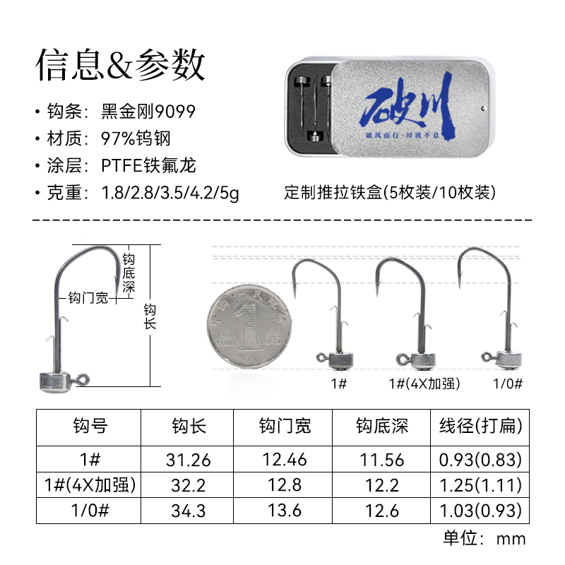 破川钨钢内德路亚钩微铅铅头钩鳜鱼鲈鱼黑坑专用大钩门小克重加强