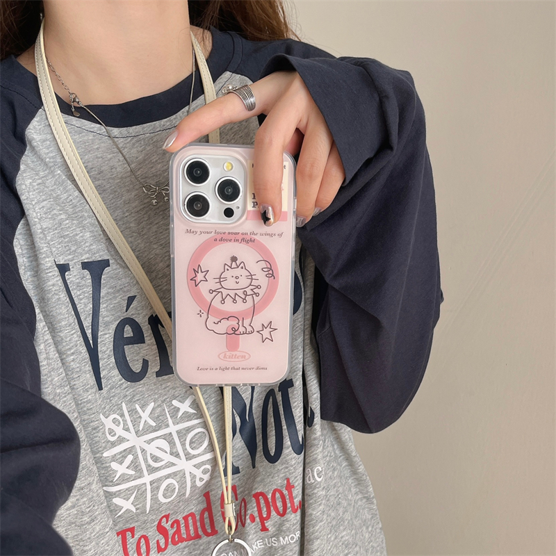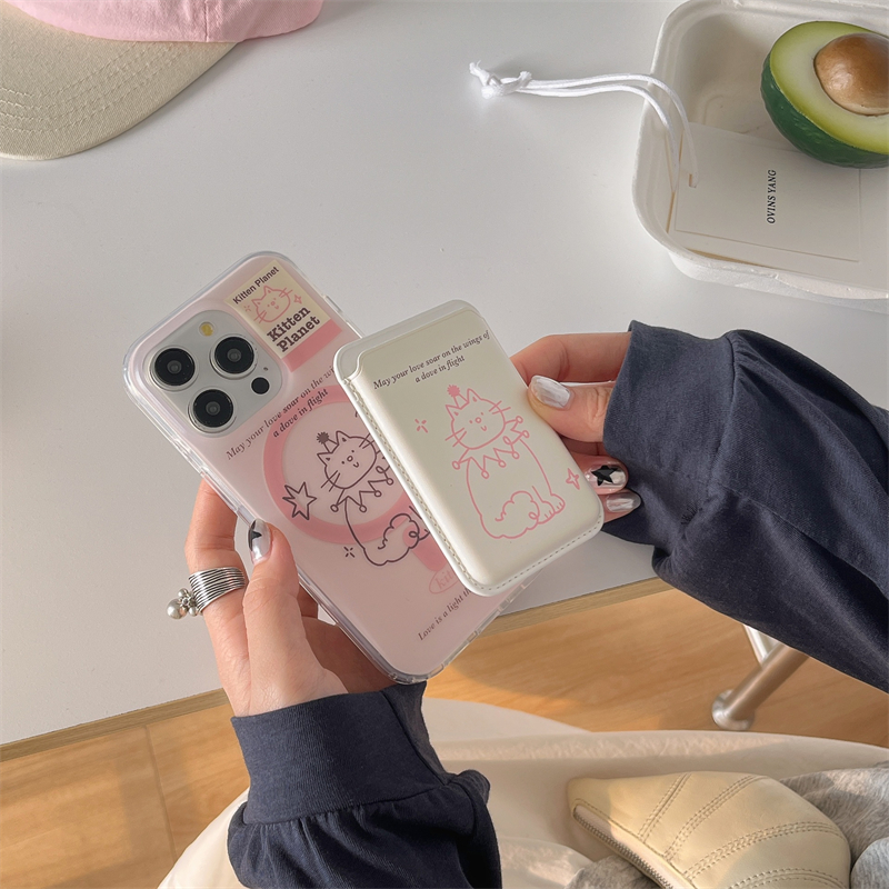 ins风可爱粉色线条星星猫咪适用12苹果15promax磁吸支架手机壳iphone14新款插卡双层16软壳13p防摔全包手机套
