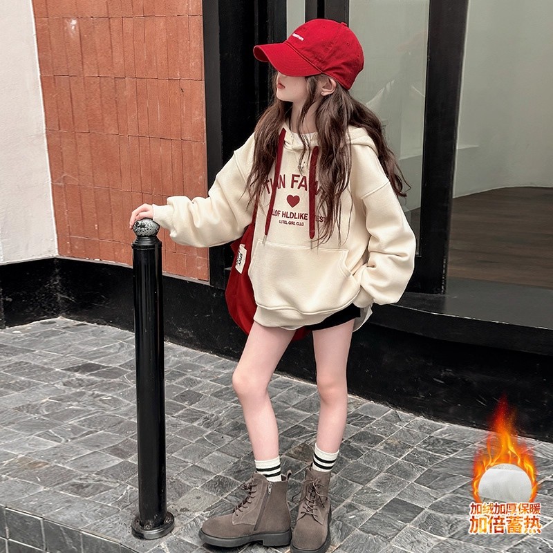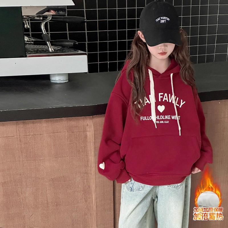 女童卫衣春秋款2025新款女大童秋装连帽上衣儿童打底衫潮加绒红色