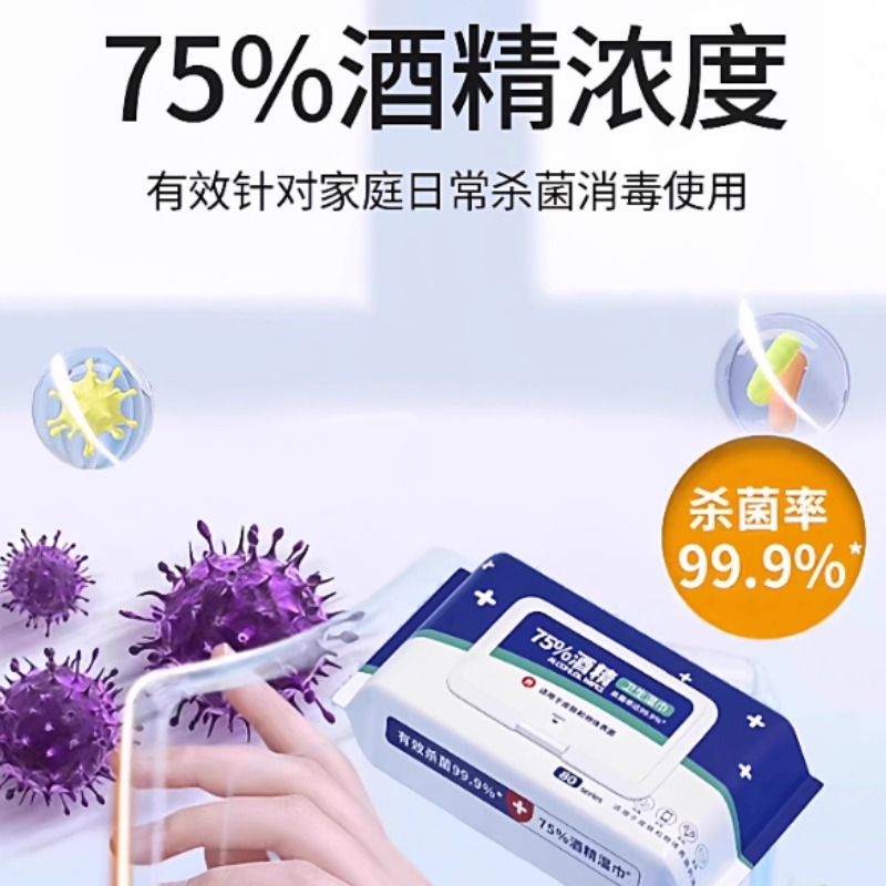 高端80抽含75度酒精消毒湿巾办公家用卫生杀菌抑菌便携带盖大包