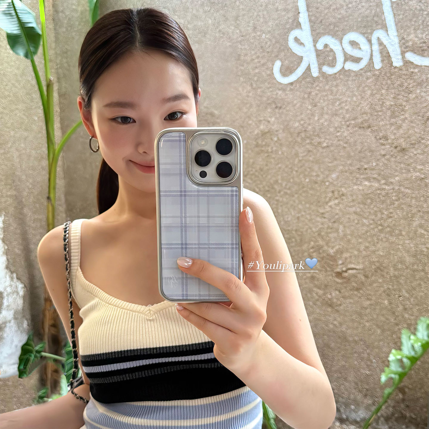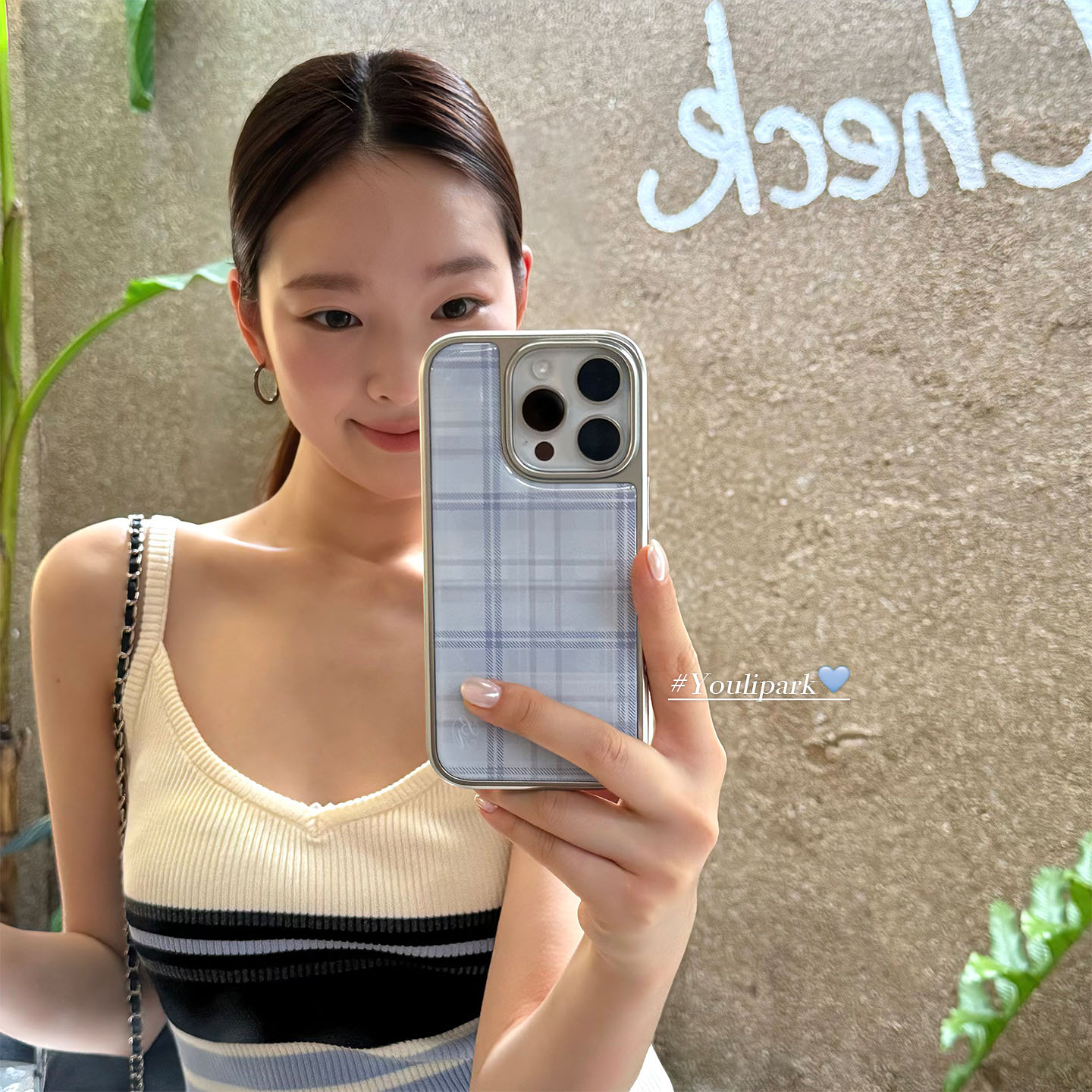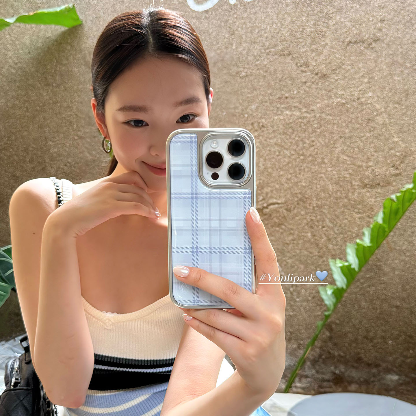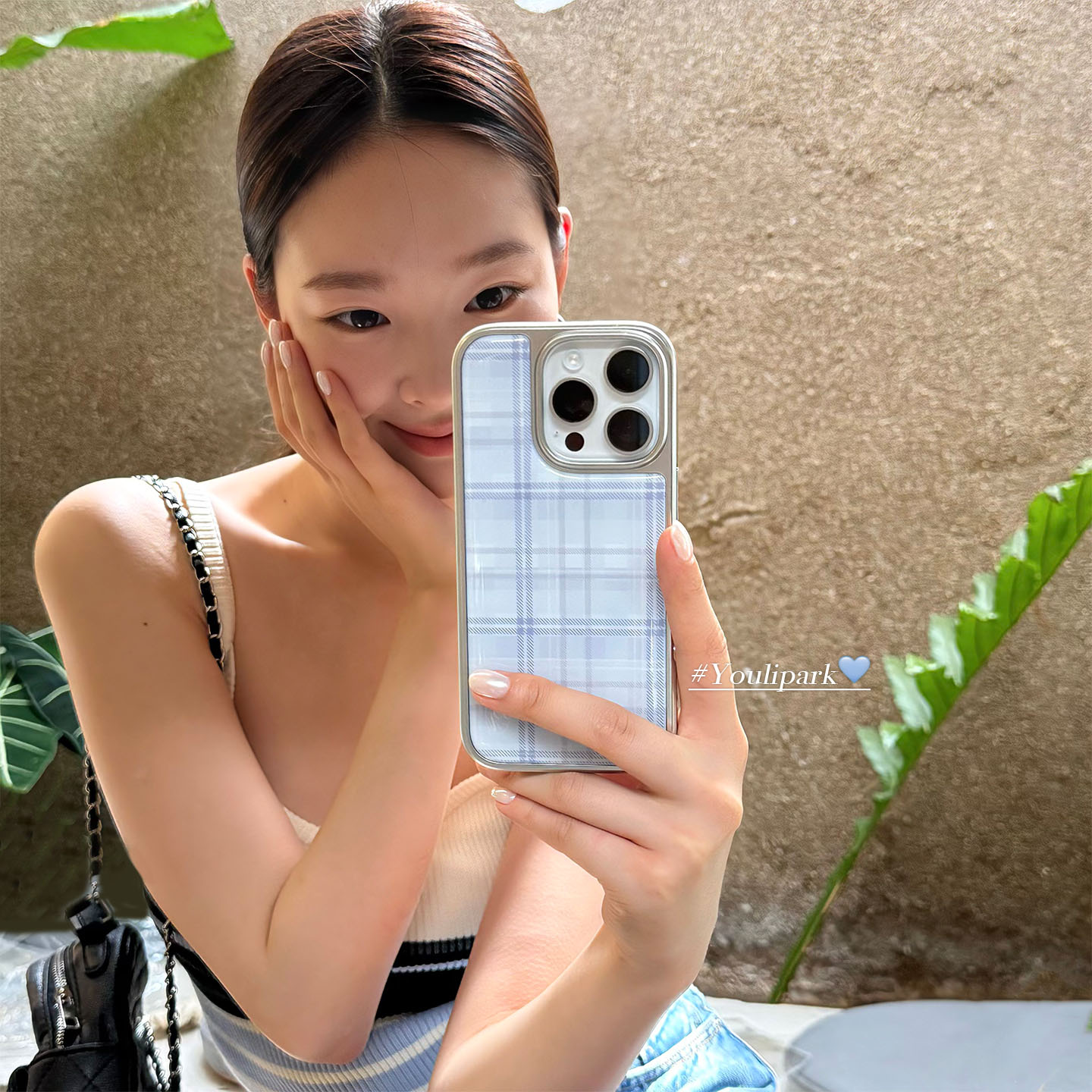 由里公园ins小众夏日电镀拼接蓝色格纹15适用16pro苹果16ProMax手机壳iPhone16全包14韩系14Promax保护套13女