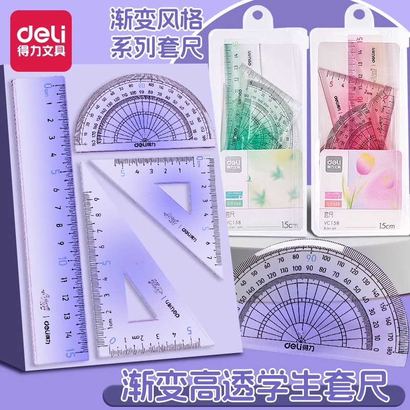 得力尺子小学生专用硬尺套装渐变色套尺四件套15cm透明直尺带波浪线一年级儿童学生文具三角尺量角器多功能