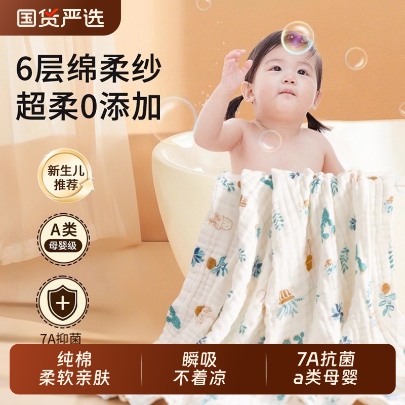 婴儿浴巾新生纱布纯棉宝宝儿童专用超软全棉四季6层a类棉纱母婴