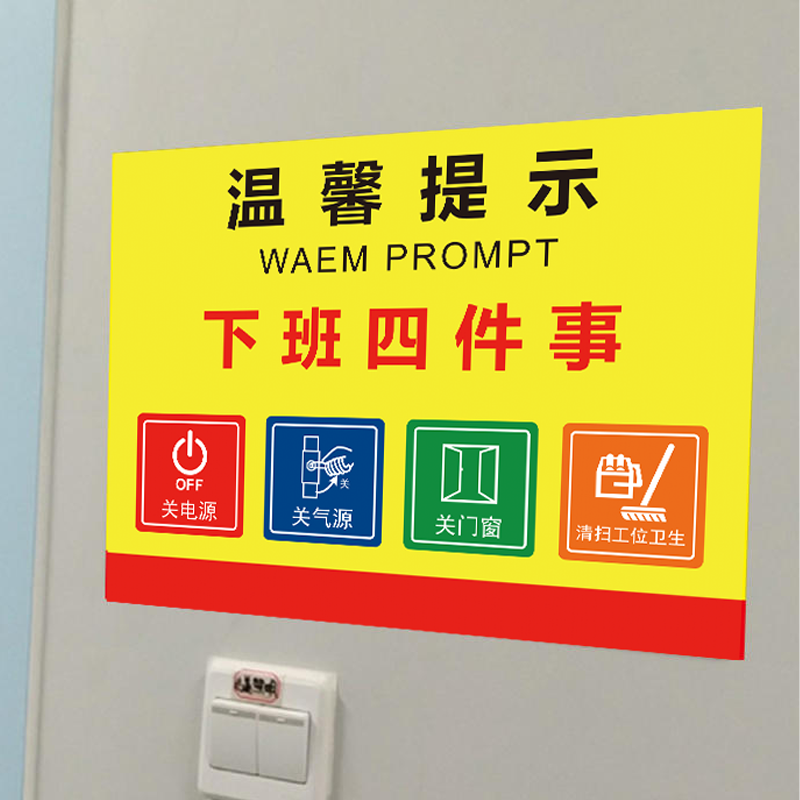 班前班后五分钟下班四件事温馨提示关电源关水关气源关门窗标识牌安全五问不安全不生产标志贴车间指示牌定做
