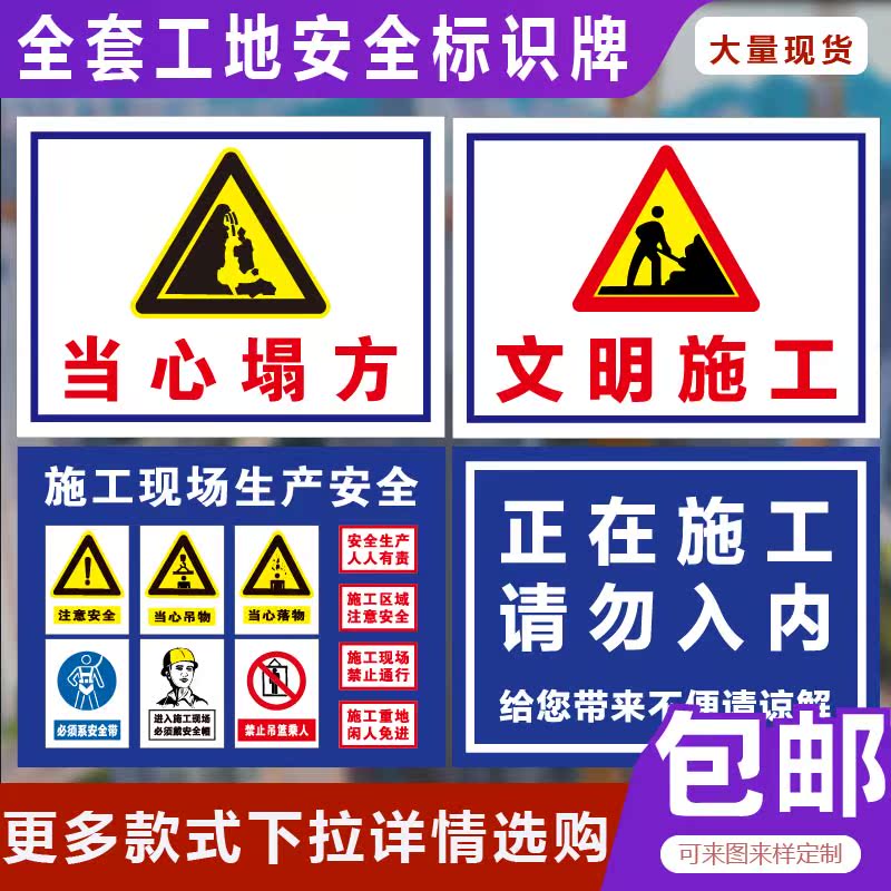 工地安全警示牌施工现场风险告知牌施工重地闲人免进戴安全帽注意安全建筑工地标识牌当心坑洞前方施工标识牌