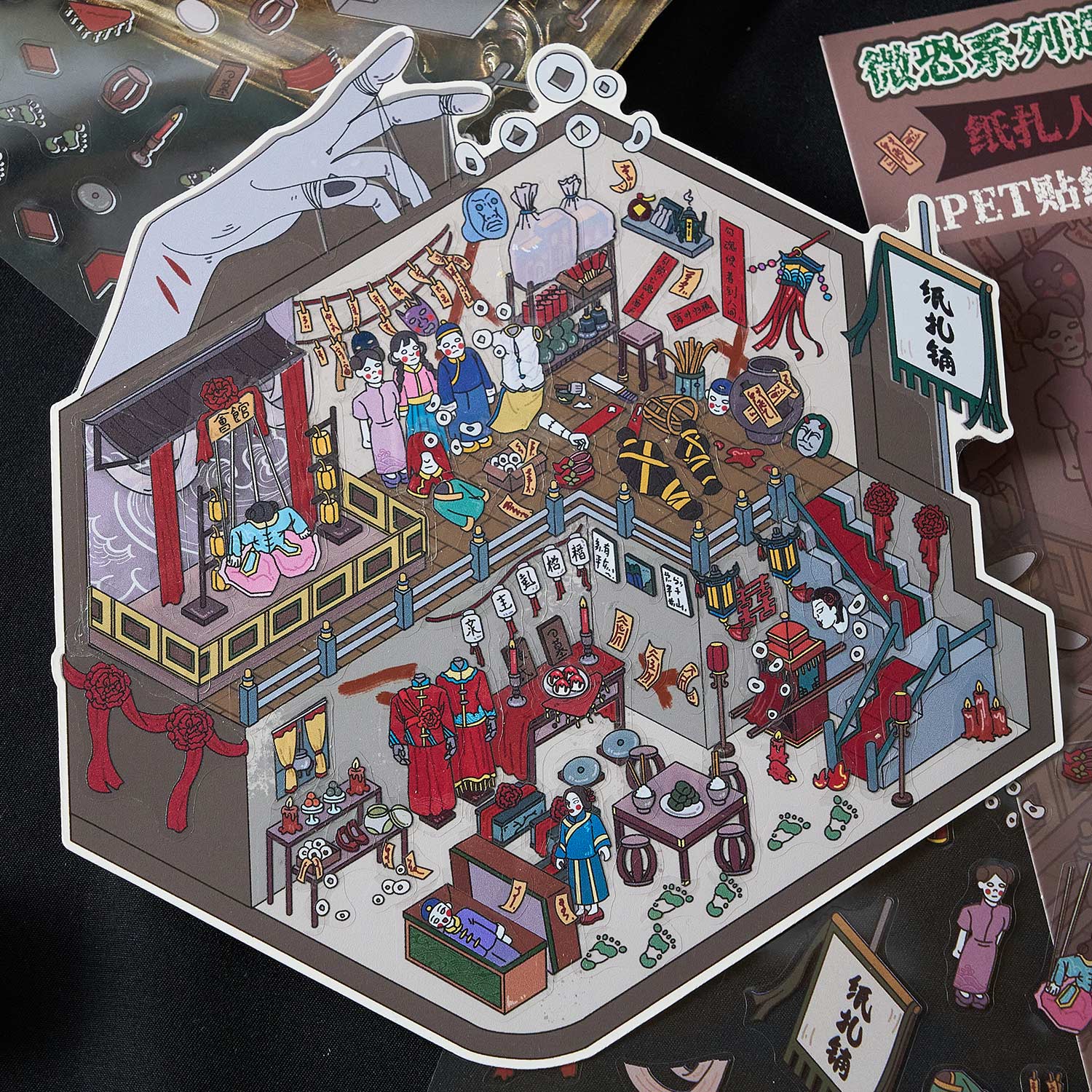 早沫微恐系列2.0造景贴纸原创中式恐怖纸扎人惊魂狐狸抢亲大号微缩场景3d立体小屋贴画手工diy手帐账解压玩具
