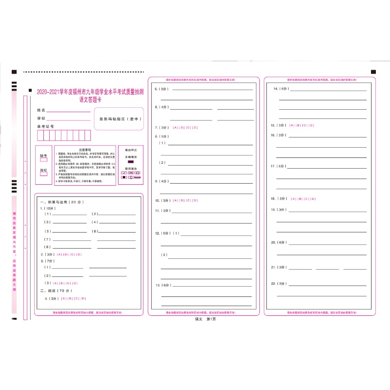 2021年福建省福州市九年级血液水平考试质量抽测 中考语文答题卡