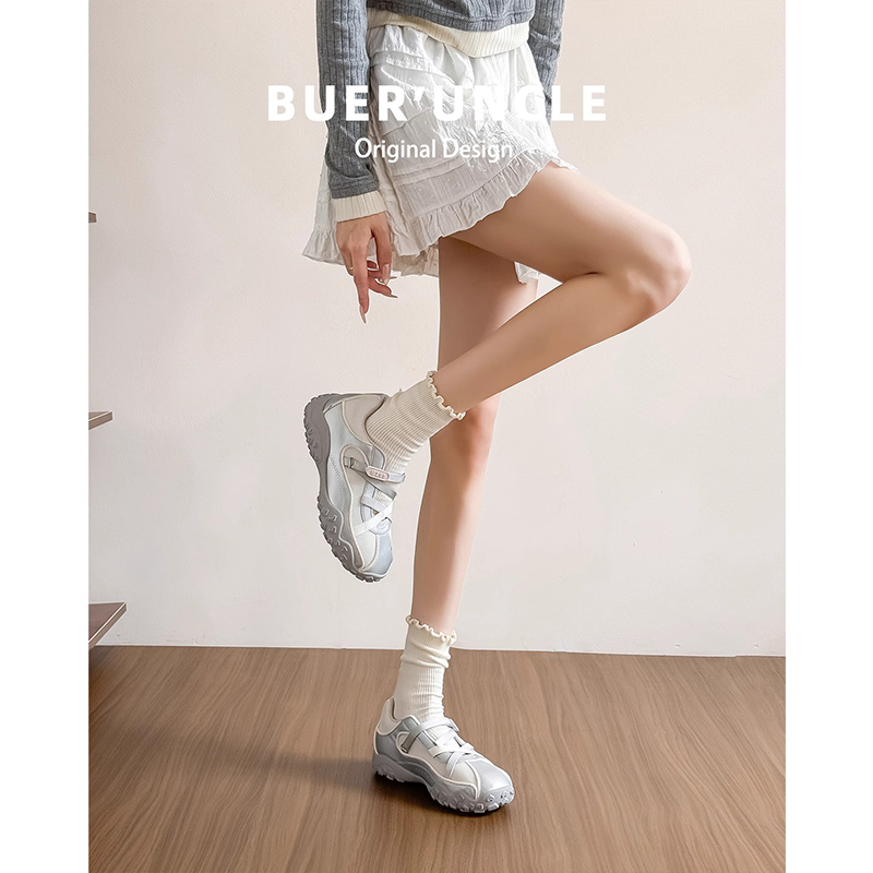 真皮~骄屿内增高蓝色运动玛丽珍鞋复古浅口芭蕾德训鞋休闲阿甘鞋