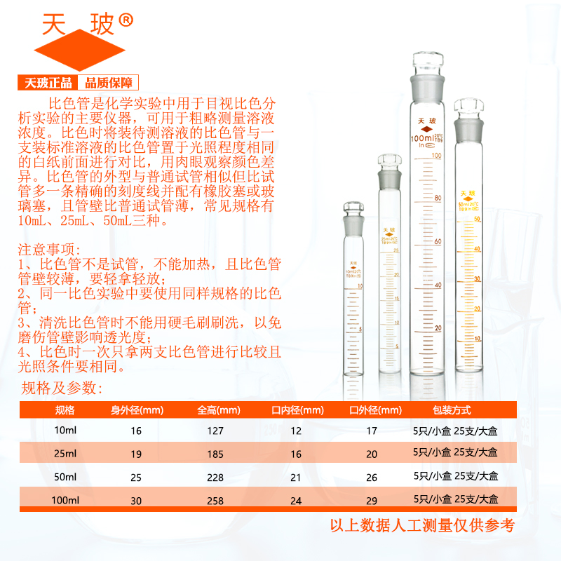天玻 具塞密度比色管A级 10ml/25ml/50ml/100ml 包过检高硼硅带刻度平底试管 密度具塞比色管 5只装 含票