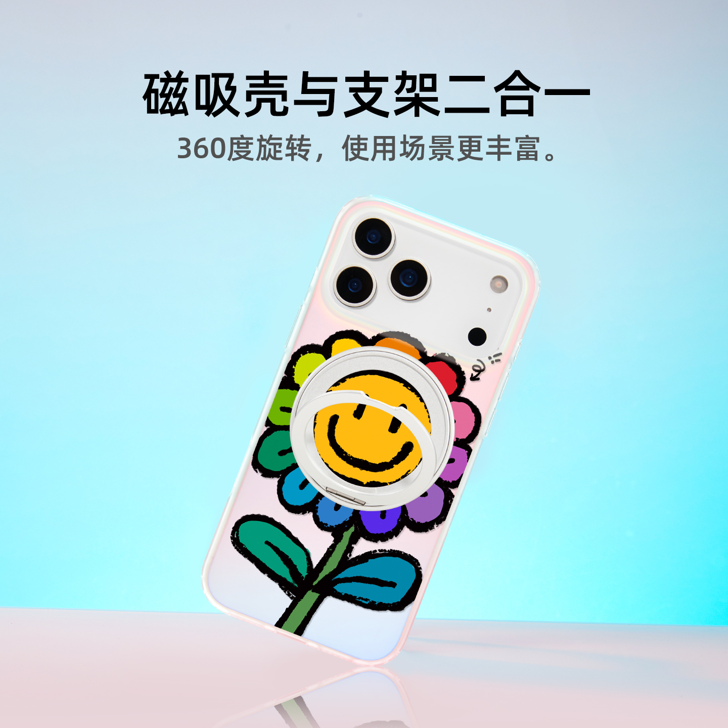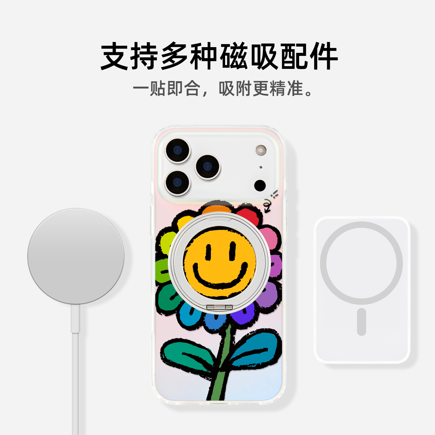 若墨适用苹果17promax手机壳新款iphone16pro磁吸15带支架支点14镭射渐变时尚13原创彩虹笑脸花小众外壳套