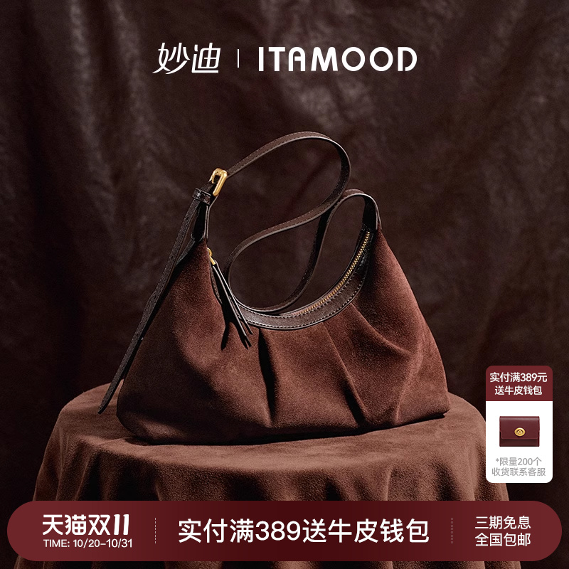 妙迪麂皮绒hobo腋下包秋冬棕色包包植鞣头层牛皮通勤手提斜挎包女