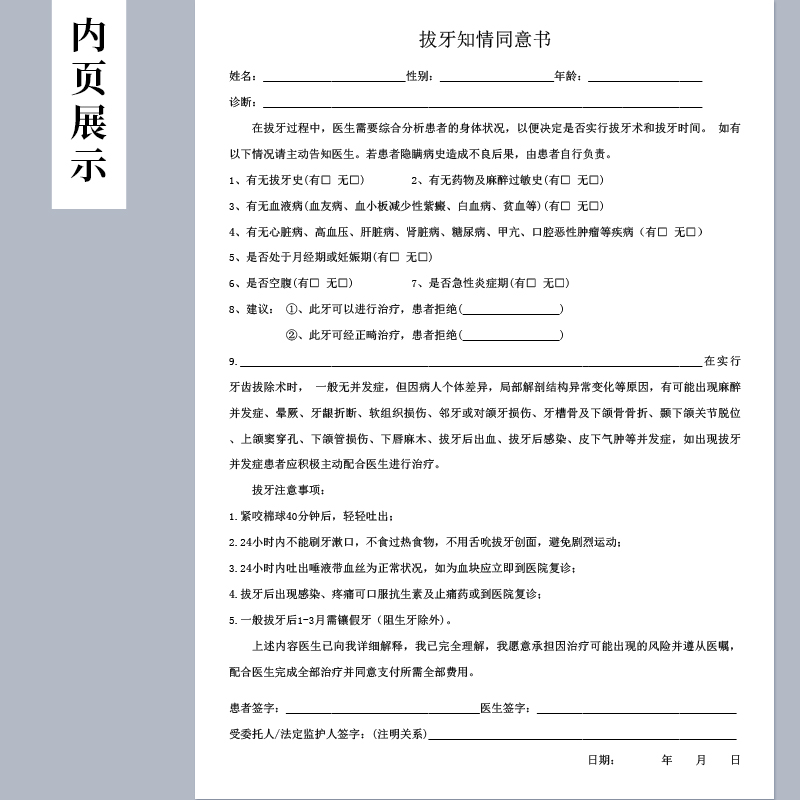 拔牙知情同意书门诊口腔科室种植牙根矫正牙齿拔牙补牙手术后处方单镶牙简介治疗注意事项牙科口腔诊所通用