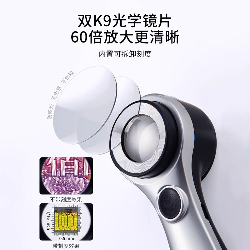 德国高倍数高清放大镜鉴定专用60倍看文玩玉石紫砂壶珠宝手表维修用电子鉴宝钱币银元1000验烟酒便携手持带灯
