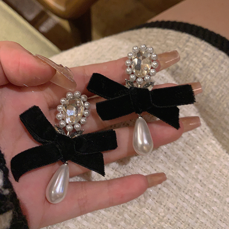 黑色丝绒蝴蝶结耳钉~富家千金风高级感珍珠耳环复古小香赫本耳饰