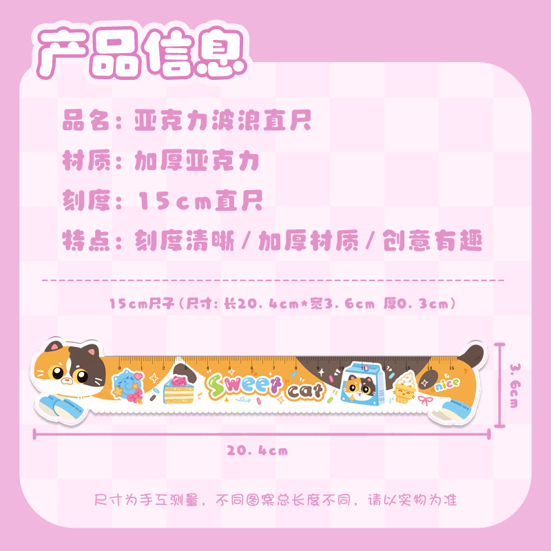 可爱猫咪尺子卡通原创亚克力加厚直尺小学生波浪尺初中生专用15cm