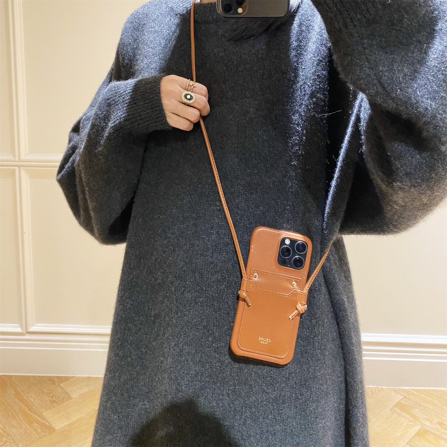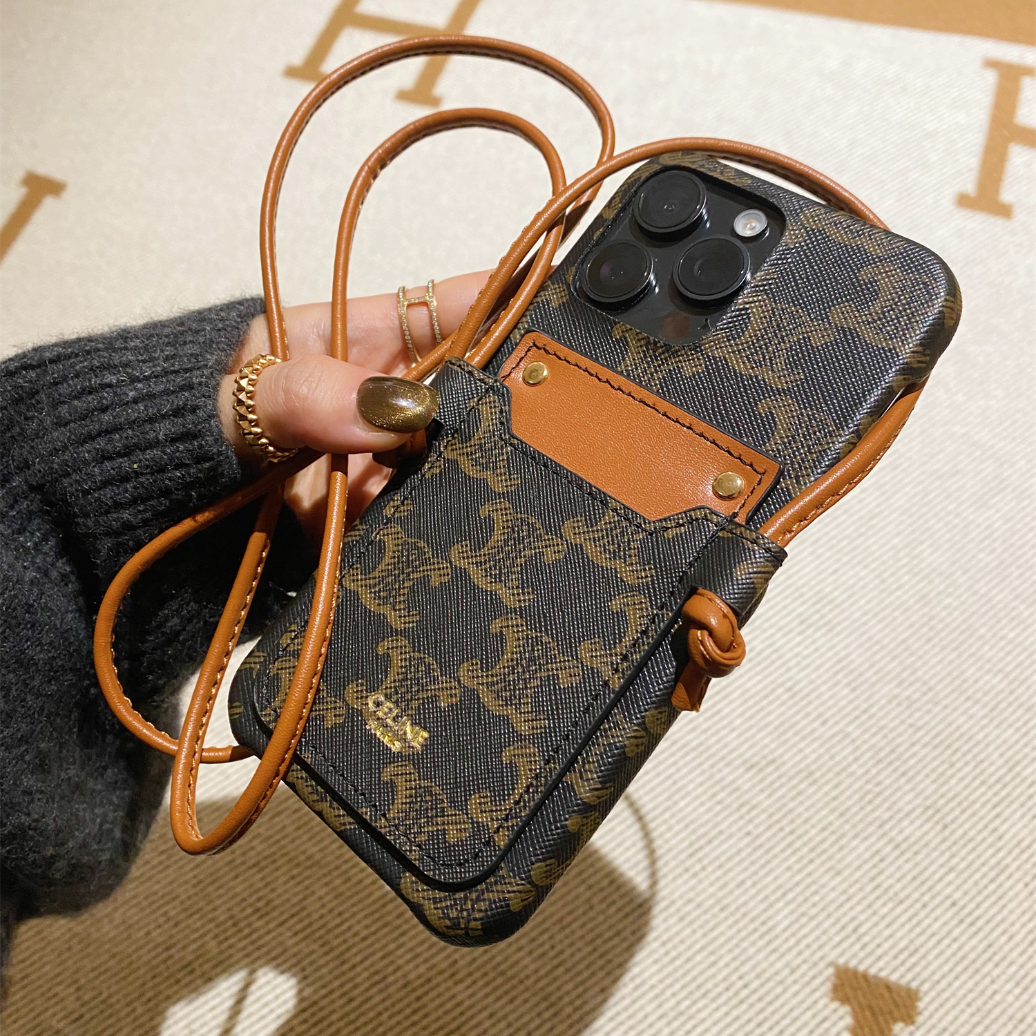 新款潮牌老花插卡斜挎适用苹果16promax手机壳iPhone15女款14pro皮质13挂绳12防摔保护套奢华高档名媛风