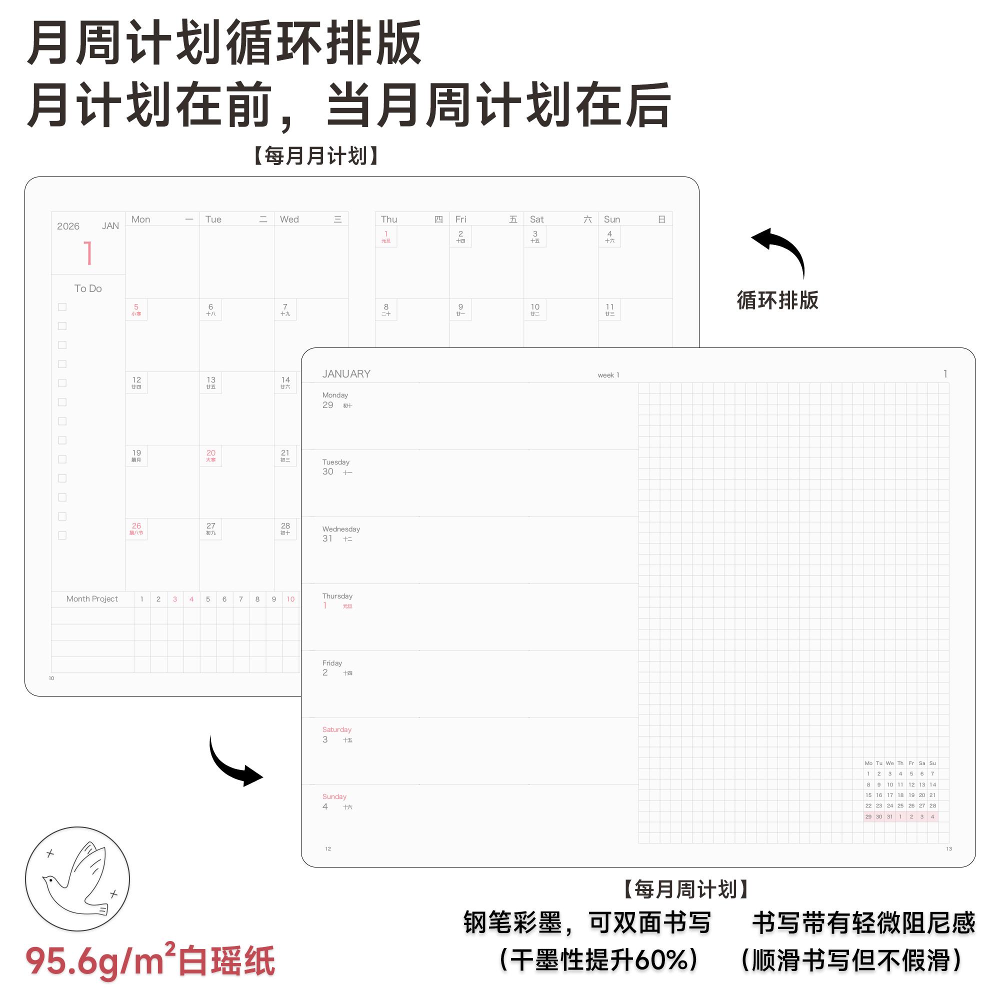 2026横版周计划B6绑带95.6g白瑶纸一周一页日程手账学习规划无酸纸记录本简约PU棉麻材质记事本高端商务定制