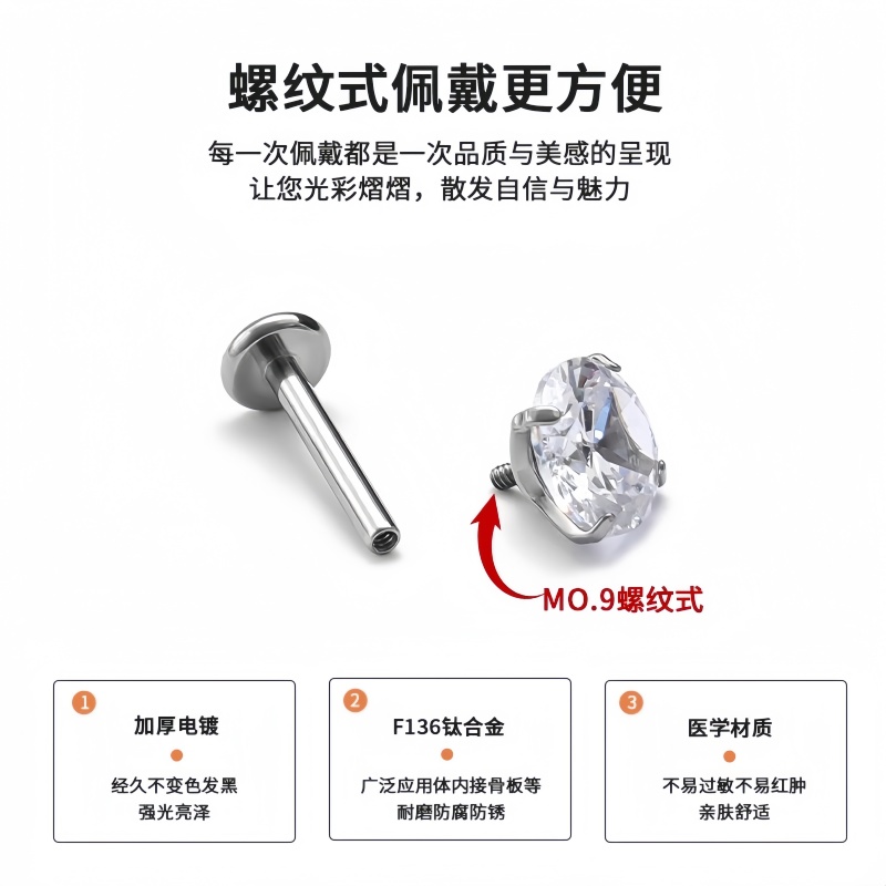 钛合金内螺旋耳钉医用爆闪螺纹防过敏养耳洞女耳蜗耳骨钉钛钢耳饰