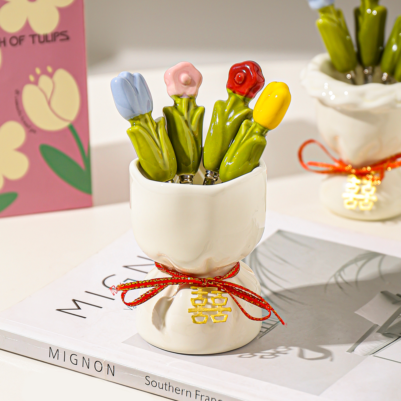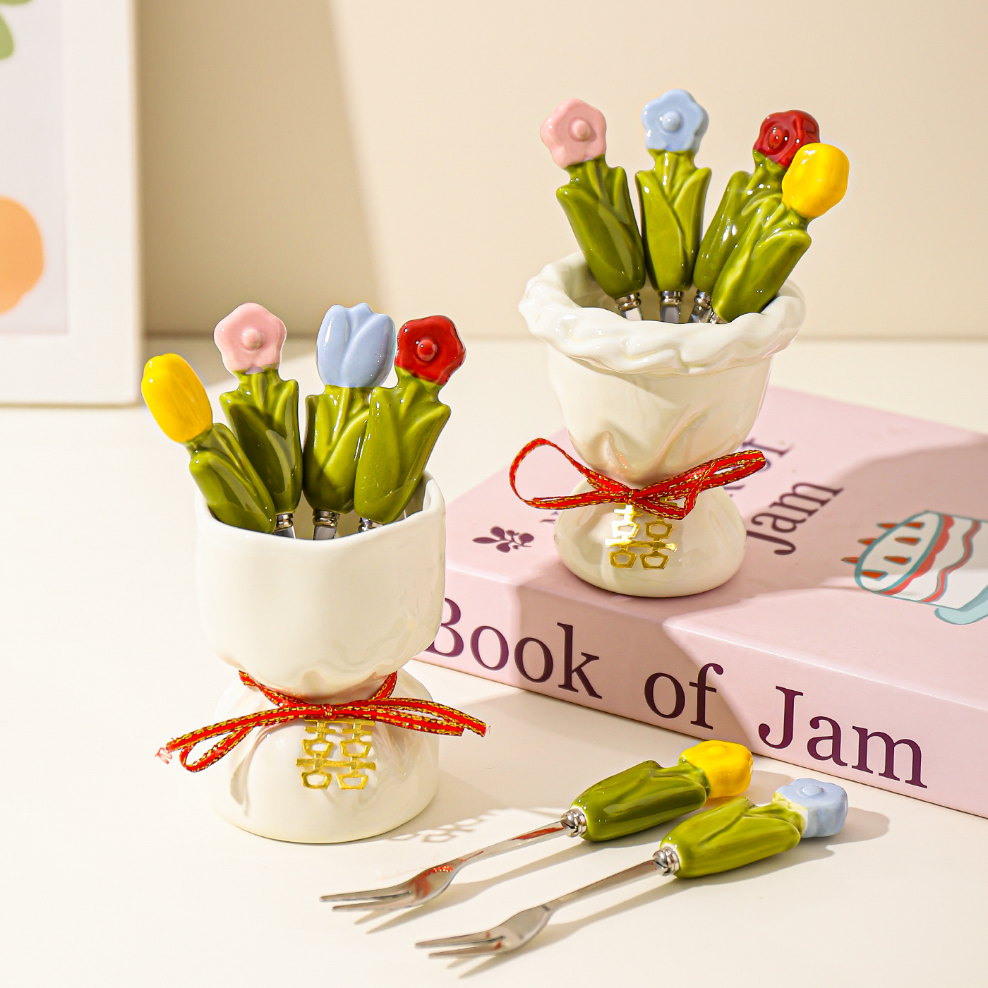 川岛屋水果叉子轻奢高级感不锈钢甜品蛋糕创意小叉子收纳罐水果签