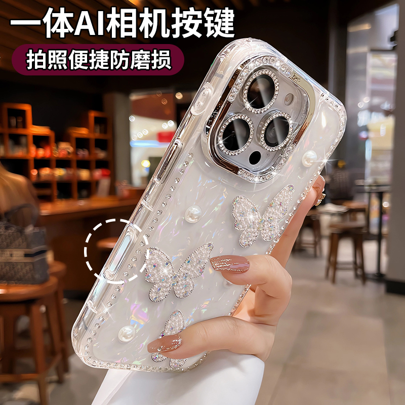 适用苹果16promax手机壳iphone15新款水钻镜头膜14pm珍珠蝴蝶贝壳纹13气囊防摔12相机按键全包高级好看外壳女