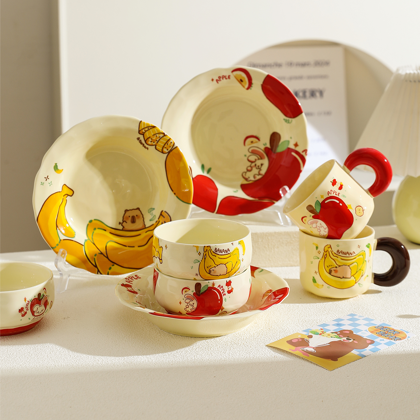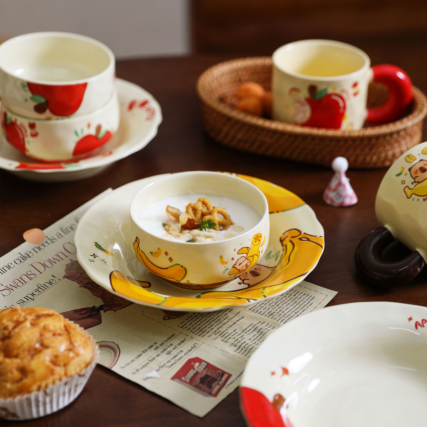 奶油风陶瓷碗家用卡通菜盘子可爱米饭碗汤碗釉下彩儿童餐具耐高温