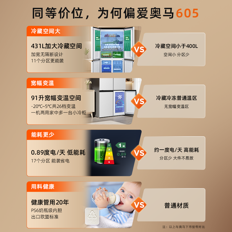 奥马605L冰箱一级能效家用变频无霜十字门国补电冰箱以旧换新补贴