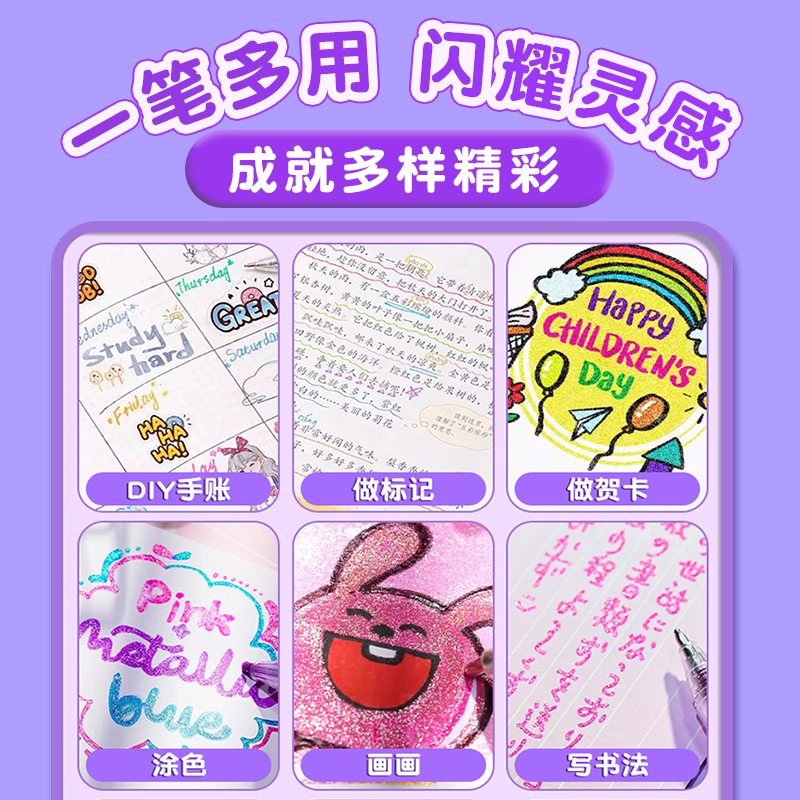 彩色闪光笔啫喱发光亮晶晶流沙银光变色做手账的手帐专用儿童莹光做笔记珠光标记闪亮金属轮廓闪粉水彩笔荧光
