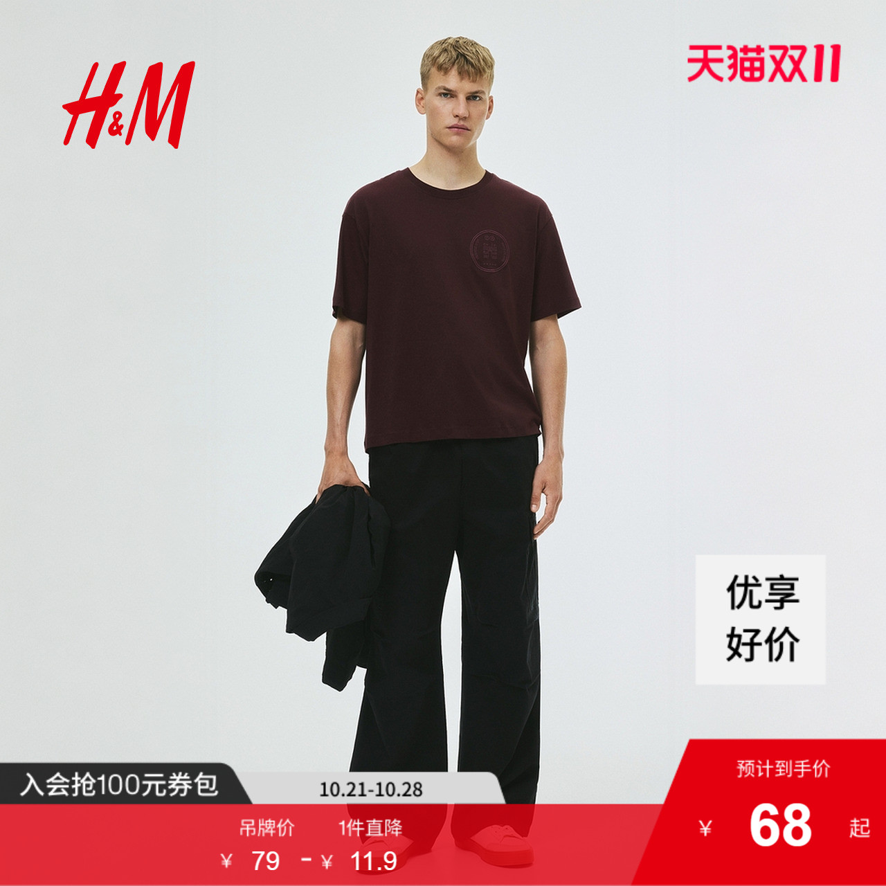 HM男装T恤2025夏季新款印花棉质中等克重落肩宽松圆领上衣1227157