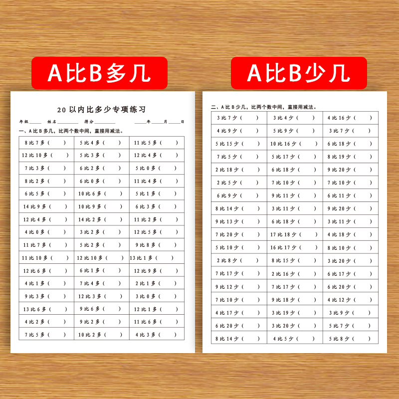 20以内比多少专项练习纸小学生一年级数学数字加法减法算式比多少比大小专项练习纸