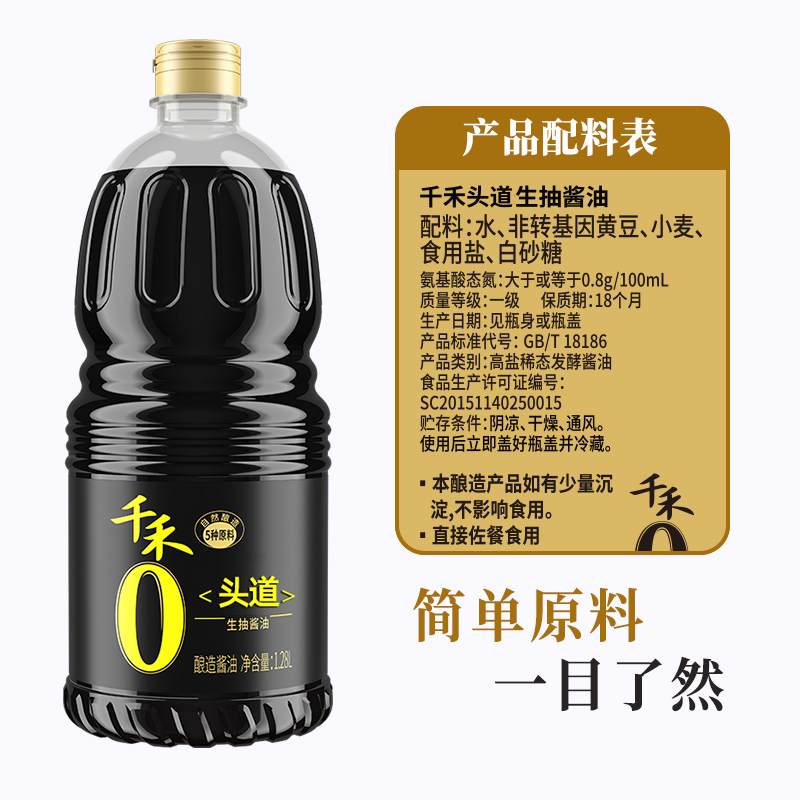 千禾酱油0添加头道酱油生抽零添加酱油1.28L炒菜凉拌不加碘调味品
