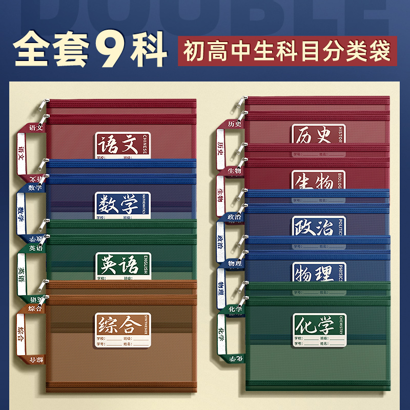 科目分类袋初中生分科文件袋拉链式手提大容量学习袋高中生作业书本试卷学科分类收纳袋资料书学生专用科目袋