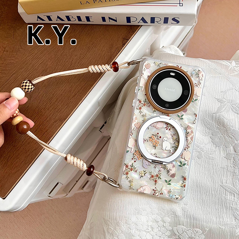 碎花猫咪手机壳带珠链挂绳适用于华为mate60/70苹果15/16手腕斜挎findx7四角开孔vivox200pro防摔小米14/15u