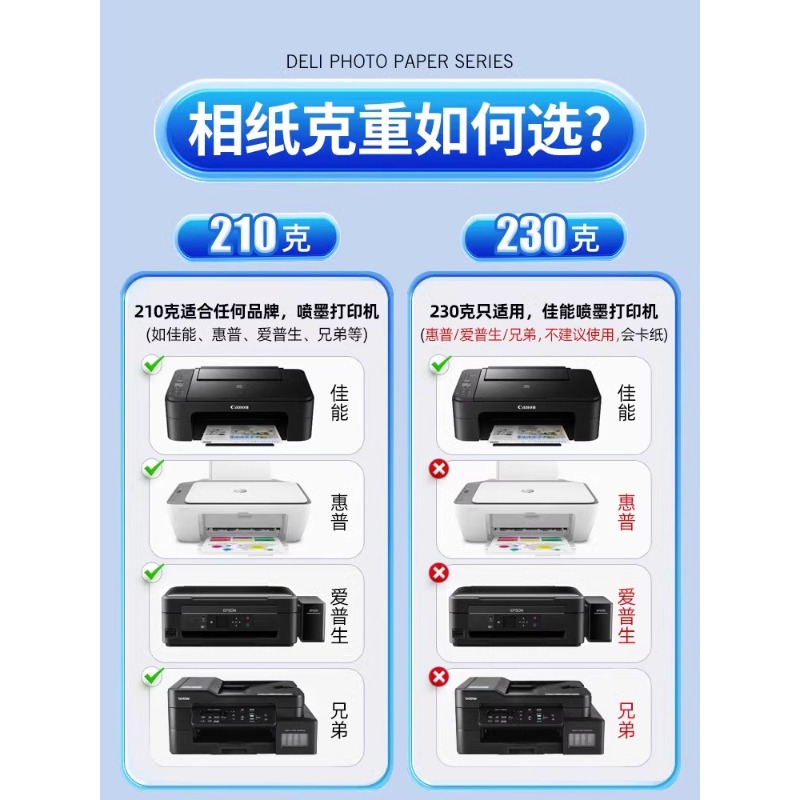 得力a4相纸防水喷墨打印机照片纸彩色着色均匀高光面相片纸200/230克家用细绒照片打印纸4r6寸7寸彩色相册纸