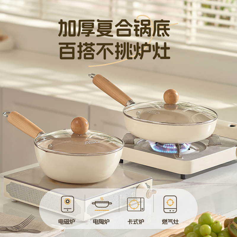 爱仕达钛陶瓷小炒锅不粘锅家用一人食无涂层炒菜锅煮泡面锅电磁炉