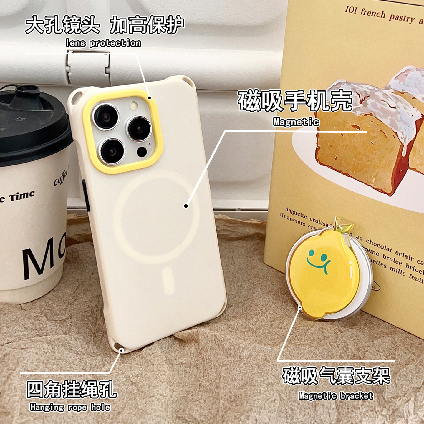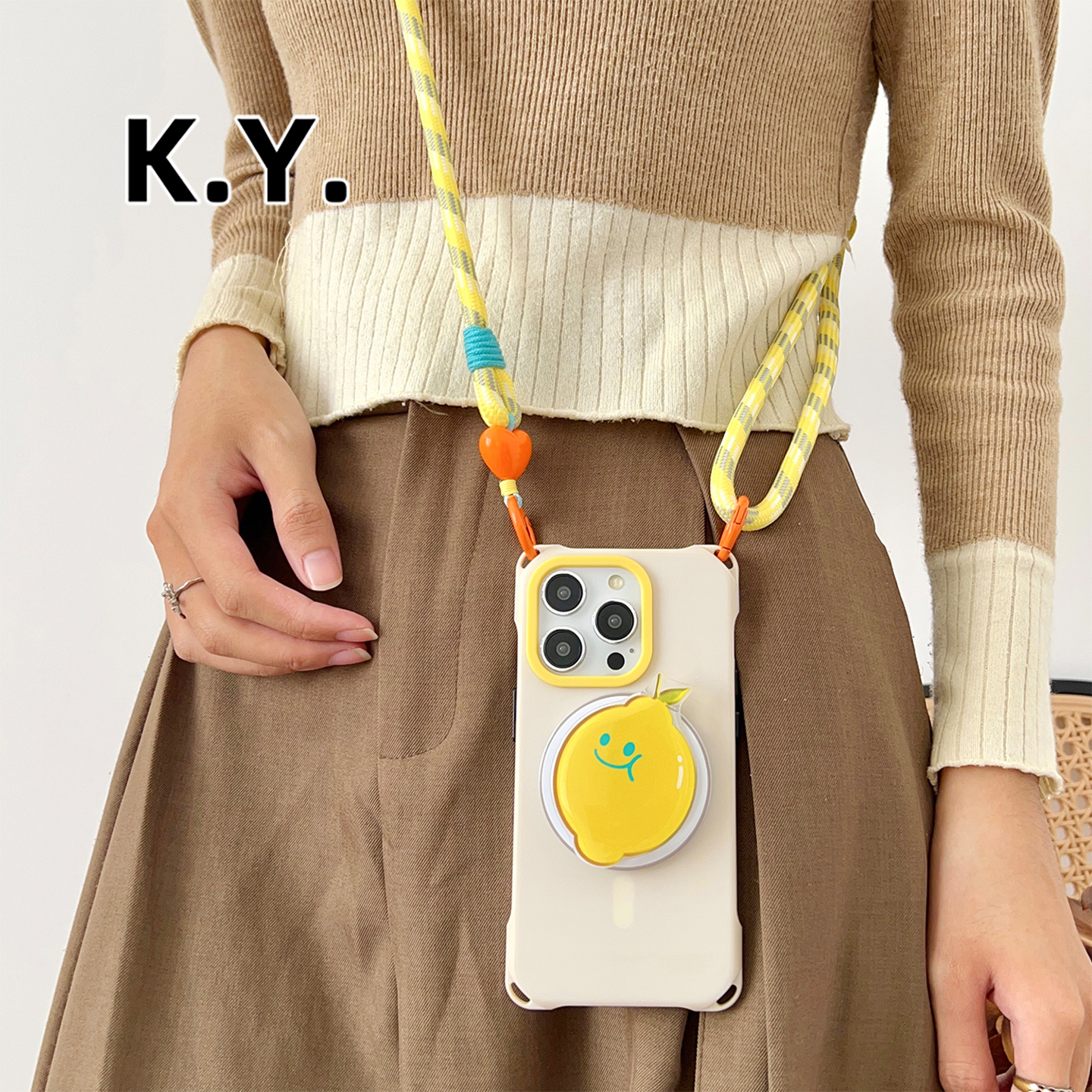笑脸柠檬磁吸支架手机壳带挂绳适用于苹果15/16华为mate60/70四角开孔小米14/15ultra斜挎背带vivo200u防摔
