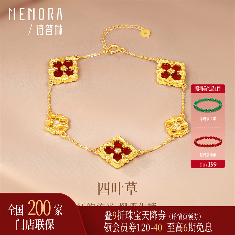 【热销】诗普琳 黄18K金镶嵌锆石红玛瑙幸运四叶草女手链送礼