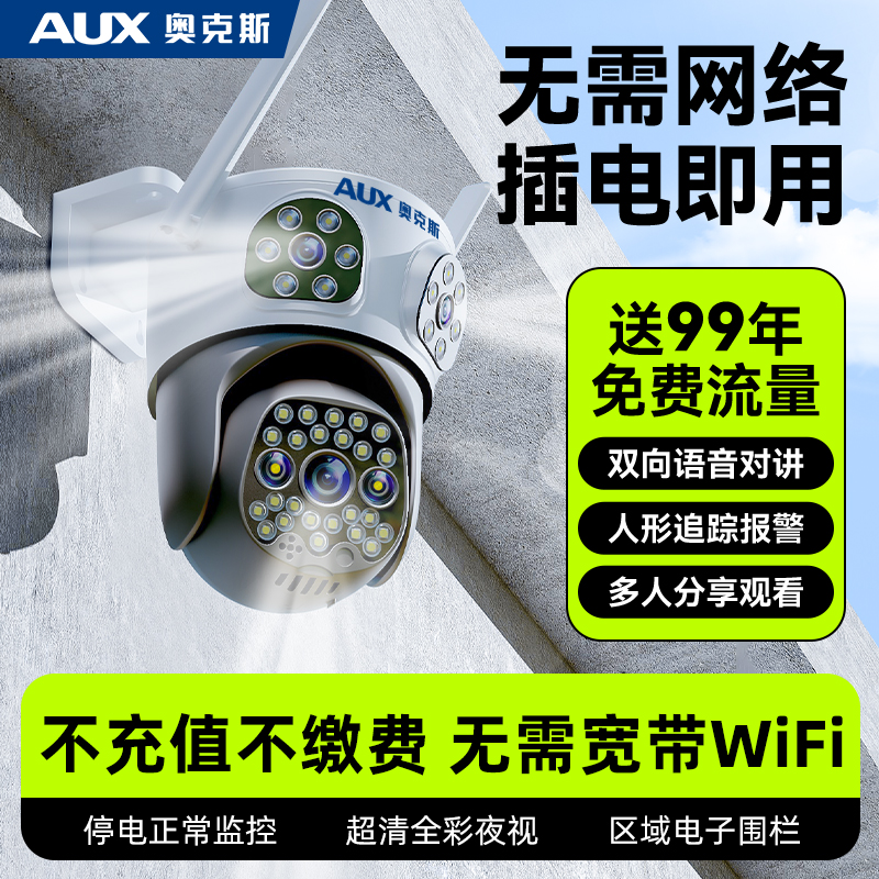奥克斯无线摄像头4G无需网络手机远程家用室内免插电360度监控器