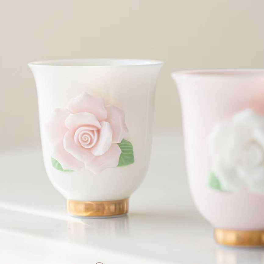 粉色羊脂玉瓷手工捏花主人杯功夫茶具茶杯白瓷情侣对杯家用礼盒装