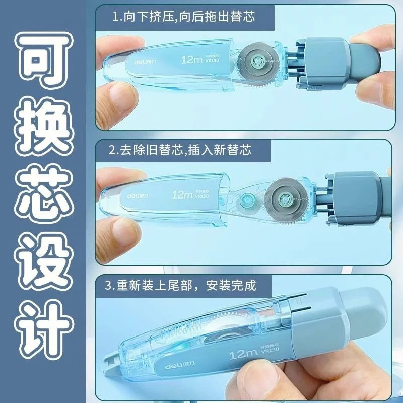 得力12m修正带学生用按动修正带可换芯12米修正带透明大容量笔型笔式修正带高颜值ins风涂改带无痕去字改正带