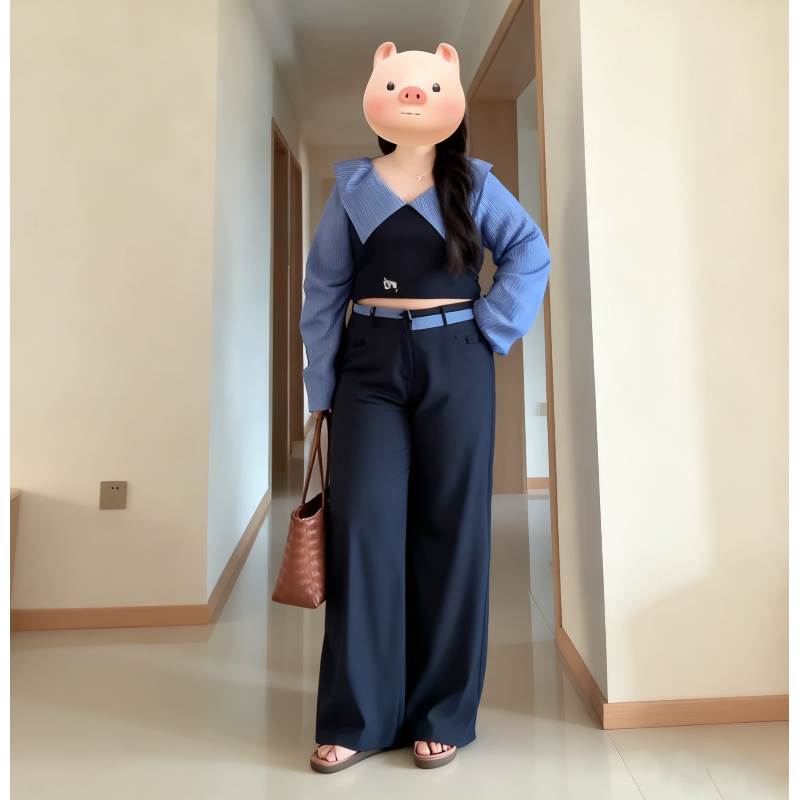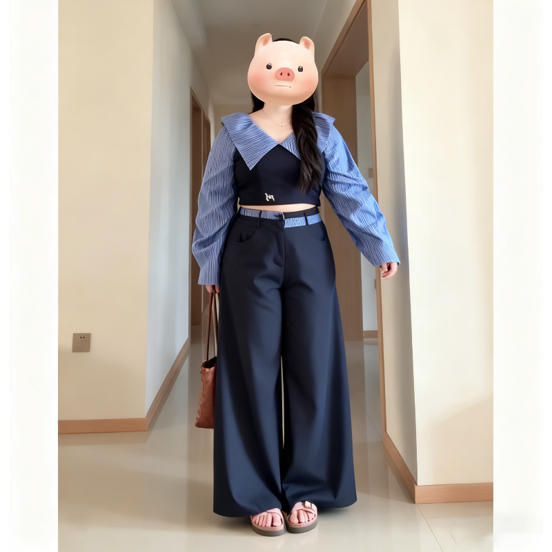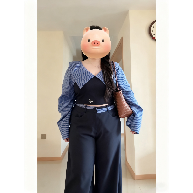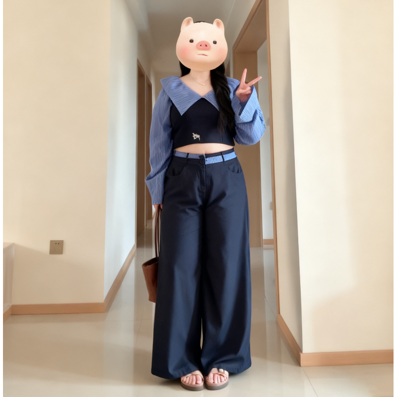 一字肩条纹拼接衬衫上衣女春季设计感大码高腰休闲裤阔腿裤两件套