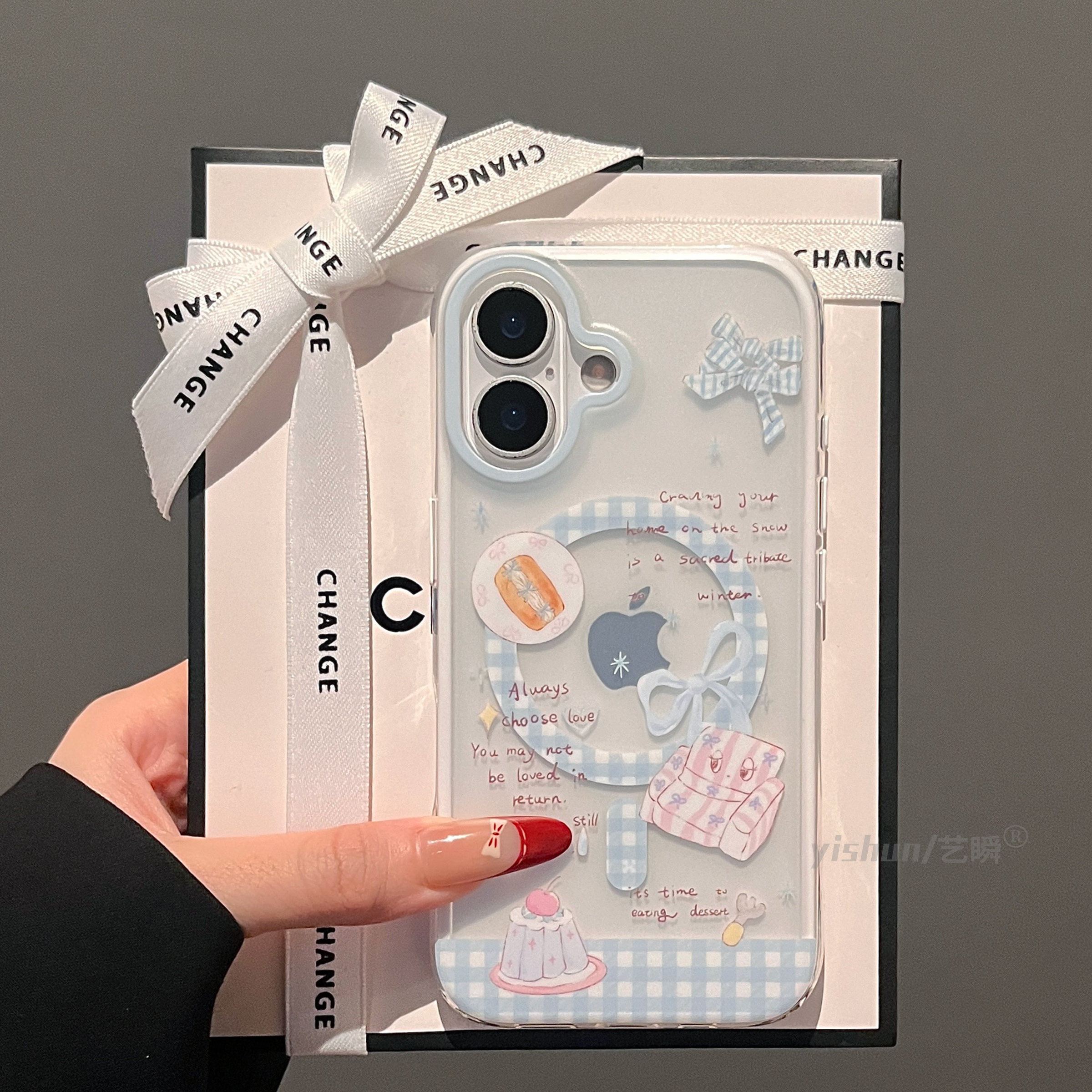 原创治愈系蓝格纹蝴蝶结磁吸支架适用16ProMax手机壳新款iPhone15pro小众高级14雾面女款13Pro好看的16保护套