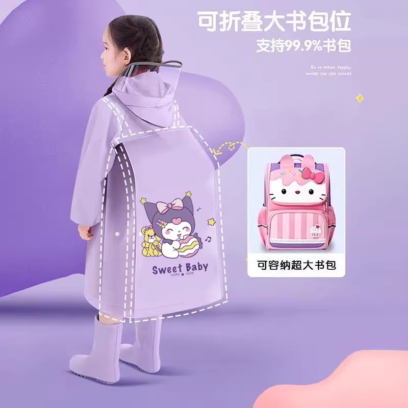 库洛米长款儿童雨衣幼儿园女童学生上学专用书包位雨披紫色雨天
