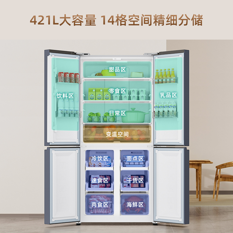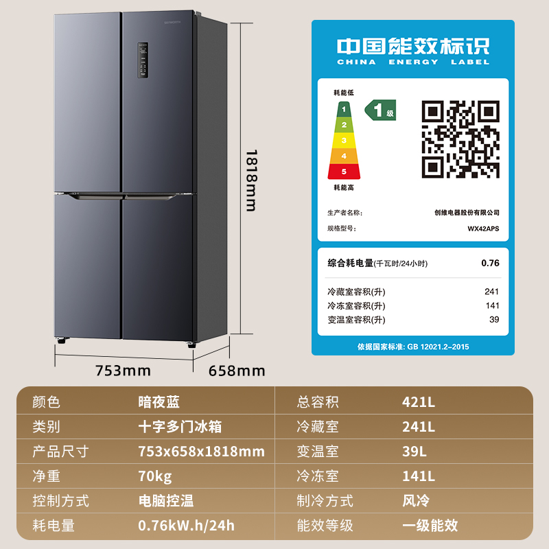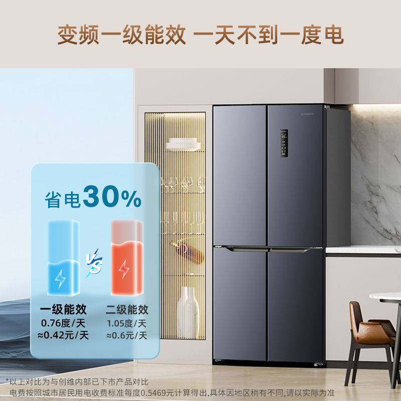 创维421升十字对开双开四门大容量一级风冷无霜嵌入式家用冰箱