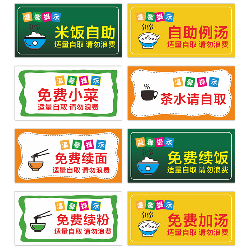 米饭自助免费小菜告示牌茶水请自取续面粉汤标识牌适量自取请勿浪费提示牌