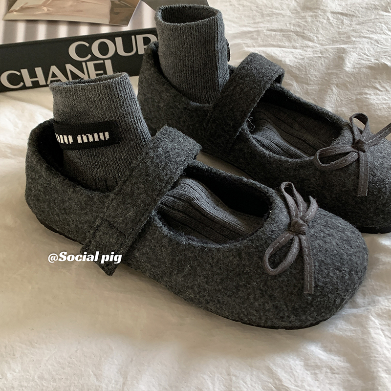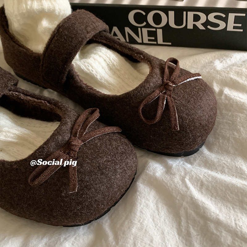 冬日的单鞋~miu系甜心~蝴蝶结平底玛丽珍加绒毛毛鞋单鞋女芭蕾鞋