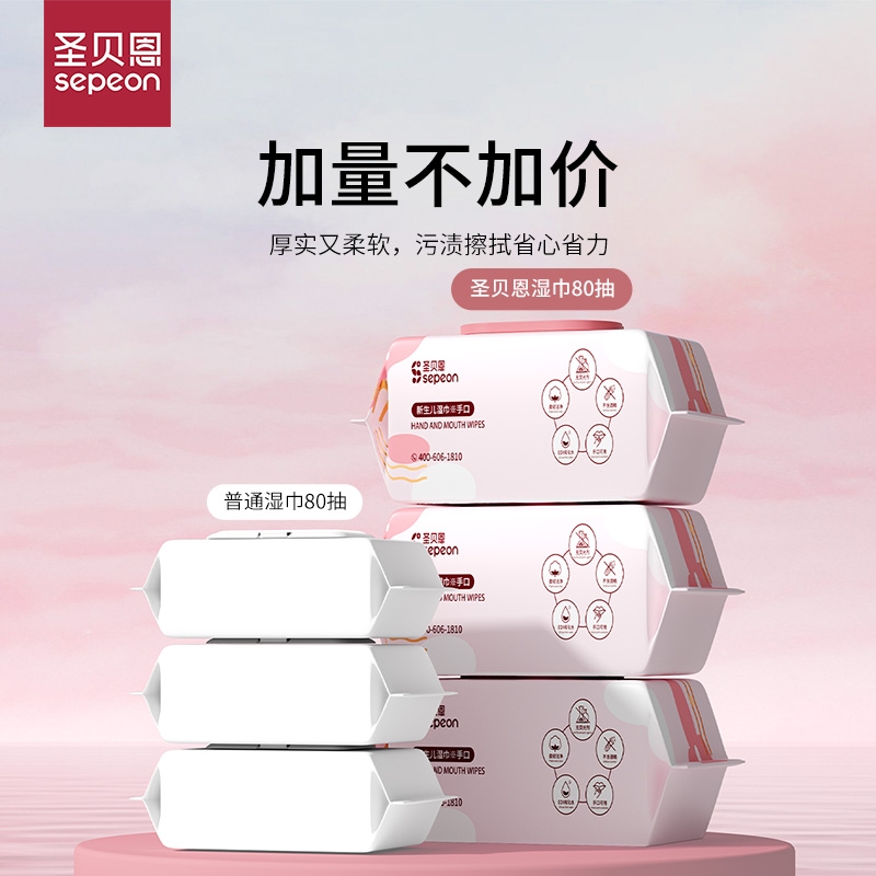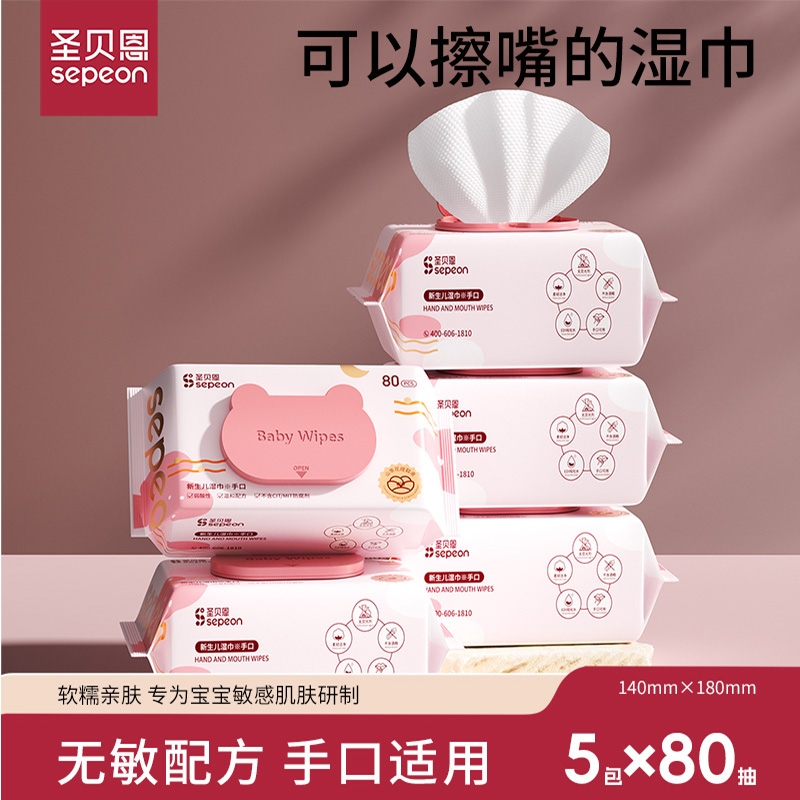圣贝恩婴儿湿巾纸新生宝宝手口专用屁幼儿童80抽5包家庭加厚大包