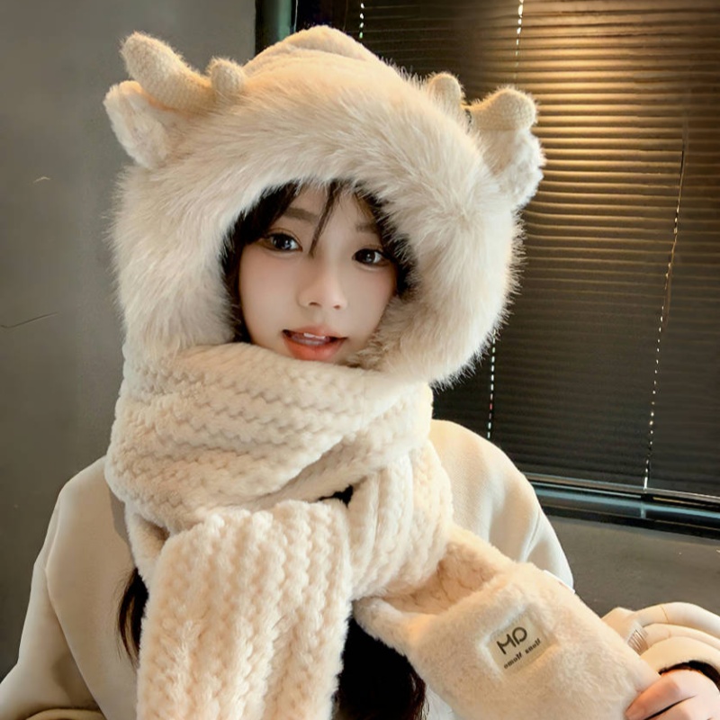 小鹿帽子秋冬女围巾手套一体冬季围脖可爱保暖毛绒三件套加绒鹿角