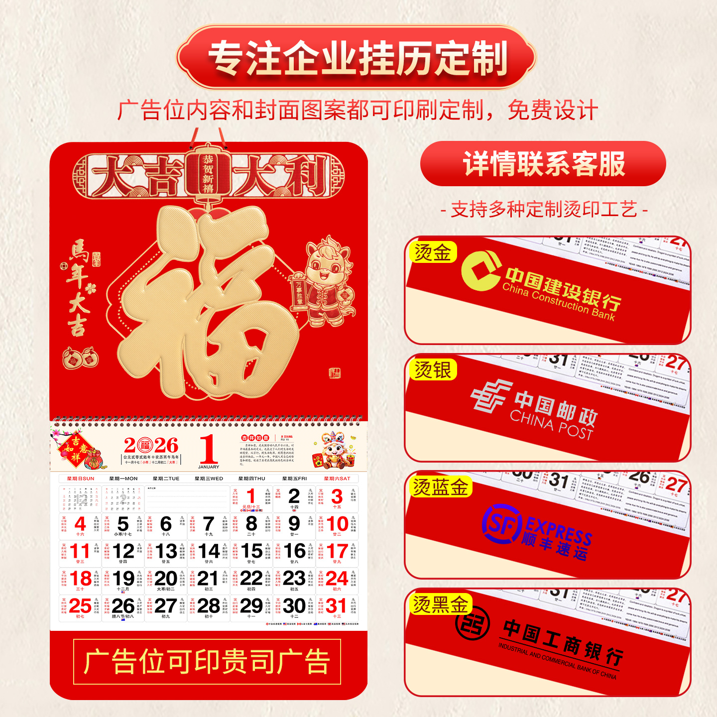 2026年福字挂历定制公司礼品手撕日历大号万年历定做创意金箔家用挂墙中国风马年月历2025年广告撕历黄历吊牌